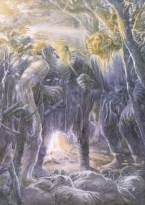 dort oben drei sehr übellaunige Trolle waren und sie sich schnellstens vom Acker machen sollten. Aber er wollte zumindest etwas mitbringen, denn immerhin hatte er nun einen Ruf als Meisterdieb zu verlieren. Er wollte einem der Trolle die Geldbörse stibitzen, aber das ging gründlich daneben. Er wurde von den Trollen erwischt und während die sich noch über ihren Fang wunderten (einen solchen hatten sie noch nie gefressen), kamen auch schon die Zwerge, einer nach dem anderen, um nach Bilbo zu suchen. Zwar sind Trolle recht dumm, aber es gelang ihnen trotzdem, alle 13 Zwerge dort oben in der Waldlichtung zu schnappen und in Säcke zu stecken. Nur mit Thorin hatten sie etwas mehr Arbeit, aber ein Zwerg und drei riesige Trolle, das konnte nicht gut gehen. Beim Kampf der Trolle mit Thorin wurde Bilbo auf einen Baum geschleudert und musste nun zuhören, wie sich die Trolle laut stritten, ob sie die Zwerge nun braten, kochen oder zu Sülze zerquetschen sollten. Wäre Gandalf ihnen nicht zu Hilfe gekommen, wäre die Geschichte hier wohl schon zu Ende gewesen. Doch Gandalf brachte die Trolle dazu, sich immer weiterzustreiten, indem er seine Stimme verstellte und die Trolle so gegeneinander aufhetzte, dass sie die Zeit darüber vergaßen, denn sonst hätten sie sich vor Aufgang der Sonne in ihrer Höhle verkrochen. Aber so wurden sie von der Sonne überrascht und wurden zu Stein, aus dem sie gemacht sind. Was waren die Zwerge froh, dass sie lebend aus den stinkenden Säcken von Herrn Beutlin und dem Zauberer Gandalf befreit wurden. Sie plünderten noch den Trollbau, wobei Bilbo sein wunderbares Schwert Stich fand und brachten dann nach Bruchtal auf, denn dahin war es nicht mehr allzuweit. Zum dritten Kapitel.