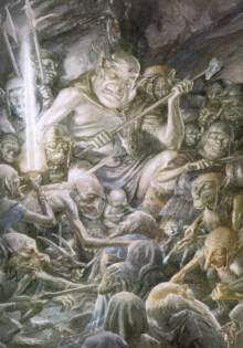 wie sie gelaufen sind! Immer angetrieben von peitschenschwingenden Ork Treibern, die dabei hässliche Lieder sangen und ihre Gefangenen verhöhnten. Schließlich kamen sie in eine große, von roten Fackeln an den Wänden erleuchtete Halle, in der sich Hunderte von Orks zu tummeln schienen. Und im Schatten auf einem flachen Stein saß ein mächtiger Ork mit riesigem Kopf und um ihn standen seine Soldaten mit Äxten und Krummsäbeln bewaffnet. Der Orkanführer verhörte die Zwerge und wollte wissen, was sie im Gebirge zu suchen hätten. Doch Thorin verriet nichts von der geheimen Mission, auf der sie sich befanden. Als der Orkfürst jedoch das Schwert sah, das an Thorins Hüfte hing (und das er bei den Trollen fand), da brach er in lautes Gebrüll aus, denn das Schwert war bei den Orks als Beiser bekannt und es hatte in grauer Vorzeit schon viele Orkschädel gespalten. Auf der Stelle wollten sie die Zwerge und den Hobbit jetzt umbringen, als plötzlich alle Fackeln in der Halle erloschen. Der Großork sollte in all dem Getümmel und Geschupse, das jetzt ausbrach noch eine andere alte Elbenklinge zu Gesicht bekommen; Glamdring, Feindhammer, von den Orks Schläger genannt. Dieses trug Gandalf und er durchsäbelte den fassungslosen Großork glatt in der Mitte. Jetzt war das Geschrei in der Orkhalle groß, denn Gandalf ist zurückgekehrt, um die Zwerge zu befreien. Im allgemeinen Durcheinander und der Dunkelheit gelang es ihnen tatsächlich, sich von den Orks abzusetzen. Gandalf zählte alle durch, alle da? Ja, dann weiter. Und so flüchteten sie durch die dunklen Gänge der Orks, die bereits zur Verfolgung angesetzt hatten. Da der arme Herr Beutlin nicht so schnell rennen konnte, trugen ihn die Zwerge abwechselnd auf ihren Rücken. Doch, oh weh, Zwerge können zwar schnelle Läufer sein, wenn sie auf der Flucht sind, aber Orks, die das Gangwirrwarr angelegt hatten und noch dazu eine Stinkwut hatten, sind noch schnellere Läufer als Zwerge. Flink wie Wiesel rannten sie durch die Dunkelheit, fast so lautlos wie Fledermäuse. Und darum hörte sie niemand kommen. Ganz plötzlich wurde Dori, der nun Bilbo trug und hinter den anderen herlief, im Dunkeln von hinten gepackt. Er schrie auf und stürzte; und der Hobbit rollte ihm von der Schulter in die Schwärze hinein, prallte mit dem Kopf gegen hartes Gestein und wusste von nichts mehr. Weiter mit dem fünften Kapitel.