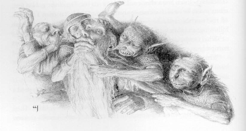 doch es war zu spät. Aus dem Spalt sprangen Orks hervor, große Orks, massige Orks, die plötzlich da waren, ehe ihr einmal Zickezacke sagen könntet. Mindesten sechs stürzten sich auf einen Zwerg und zwei sogar noch auf Bilbo und alle wurden sie gepackt und durch den Spalt weggetragen, ehe ihr Blitzdonnerwetter sagen könntet. Alle, bis auf Gandalf. Soviel wenigstens hatte Bilbos Schrei genützt, als ihm nämlich die Orks zu Leibe rücken wollten, gab es einen gewaltigen Blitzschlag in der Höhle und mehrere Orks fielen tot um. Aber die Zwerge und Bilbo wurden in das Innere des Gebirges verschleppt. Ein Stück wurden sie getragen, aber nicht für lange, dann mussten sie selber laufen. Und